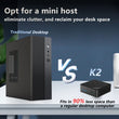 While traditional consoles are still occupying your desktop space, the mini console K2 makes a stunning debut with its exquisite body of 12.8×12.8×4.6cm. It can be easily hidden in the interlayer of a commuter bag/stuffed into the gap of a suitcase/hung behind a monitor. It can be transformed into a mobile workstation during business trips and a temporary office in a cafe can be turned into an efficient battlefield in seconds.
